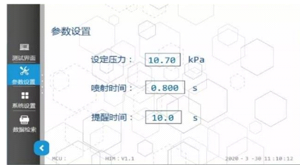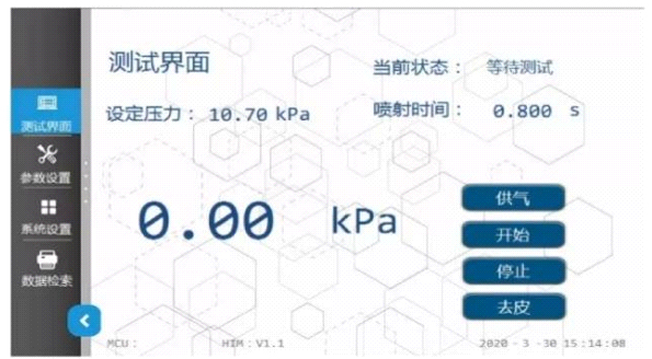 2、使用控制系统软件控制压力和喷射时间,设定压力后可实现自动稳压,压力和喷射时间数字显示,可根据实际情况进行精确调整;